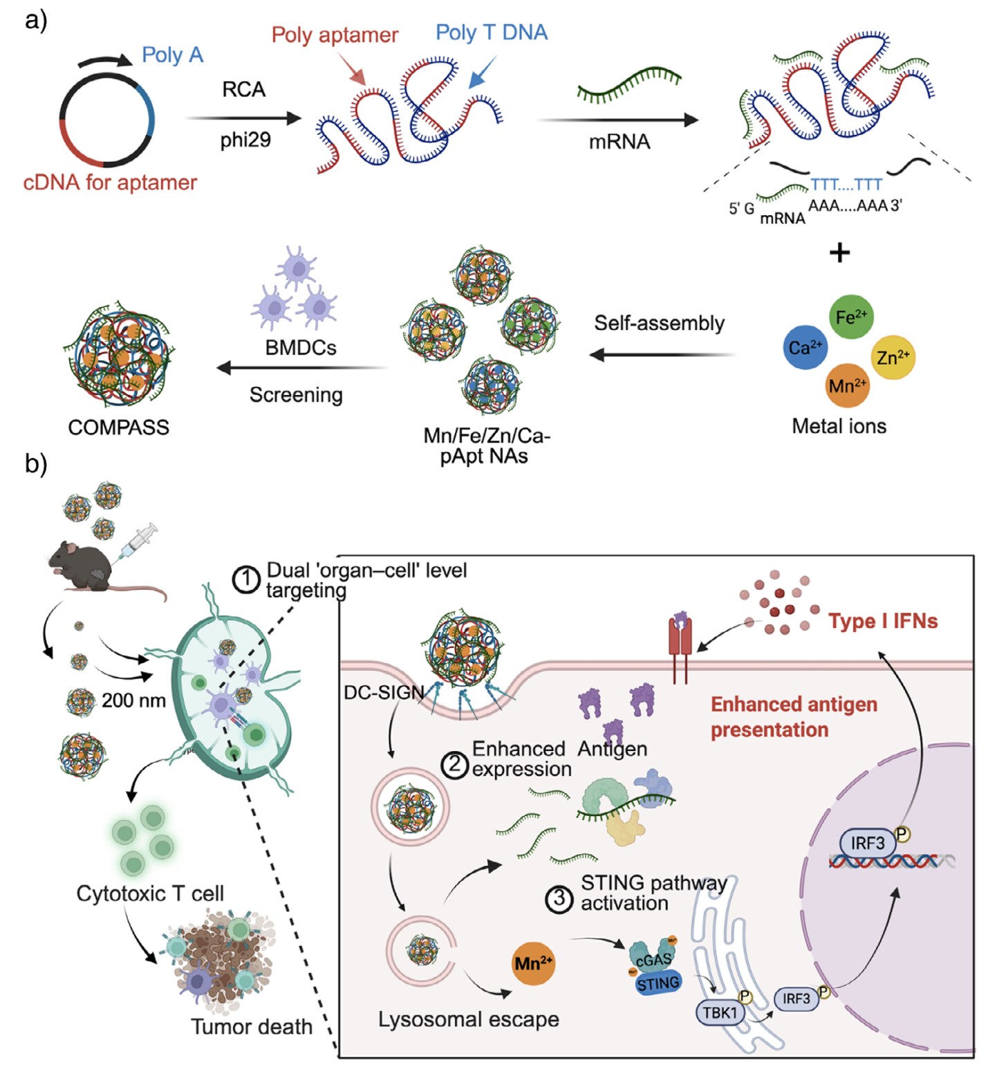 为了破解这些难题,研究者从导航定位(靶向)和动力增强(佐剂)两个维度出发,设计了全新的递送方案。 02 创新:COMPASS 系统的多能“指南针” 研究团队利用滚环扩增技术 (RCA) 构筑了一根超长的单链 DNA “骨架”,并巧妙地集成了多种功能模块,将其命名为 指南针系统(COMPASS, Manganese-Coordinated Polyvalent Aptameric System): - 多价适体实现“器官-细胞”双级靶向: 通过尺寸优化和多价适体精准识别能力,能够特异性靶向淋巴结组织中的树突状细胞表面的 DC-SIGN 受体,实现细胞级的精准导航。